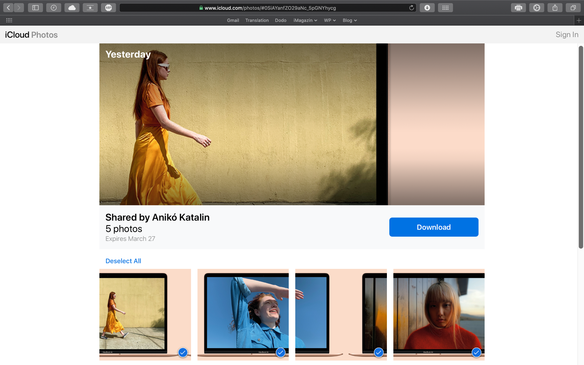 Odkaz v prehliadači vášho počítača otvorí pekne navrhnutú stránku na sťahovanie na iCloud.com s rovnakou mriežkou náhľadov ako vo Fotkách.