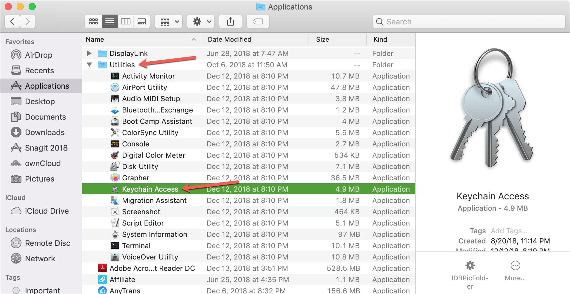 - Vyberte priečinok Utility a otvorte Kľúčenku dvojitým kliknutím.