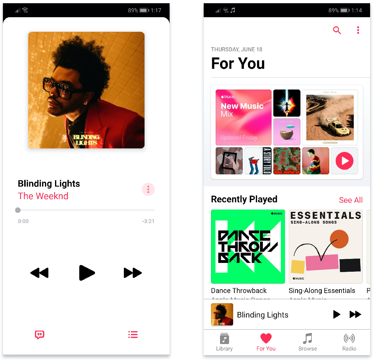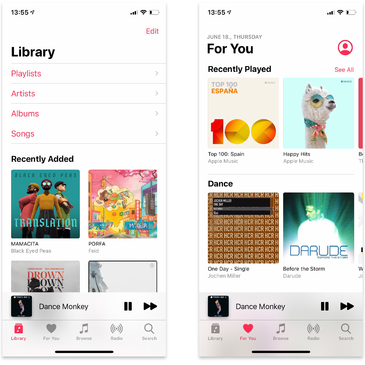 Používateľské rozhranie je rozdelené do 4 častí, ktoré sú prístupné zo spodného navigačného panela. Všetku svoju hudbu nájdeš v „Library“, teda v knižnici. Je to tvoj osobný výber skladieb, ktoré sa ti páčili alebo si si ich uložil(a). Ak sa ti páči, čo počúvaš, ťukni na tri malé bodky vedľa názvu skladby a potom na tlačidlo pridania do knižnice „Add to Library +“. Skladba odteraz bude v tvojej knižnici. Prechádzanie kolekciou skladieb je intuitívne, celá štruktúra je založená na bývalom vzhľade iTunes, takže ti môže byť povedomá. V tomto rozhraní tiež uvidíš hudbu, ktorú si si pridal(a) naposledy, takže nebudeš musieť dlho hľadať a hneď budeš môcť pokračovať v počúvaní tam, kde si prestal(a). Vytvorené playlisty sa dajú jednoducho zdieľať s rodinou a kamarátmi.