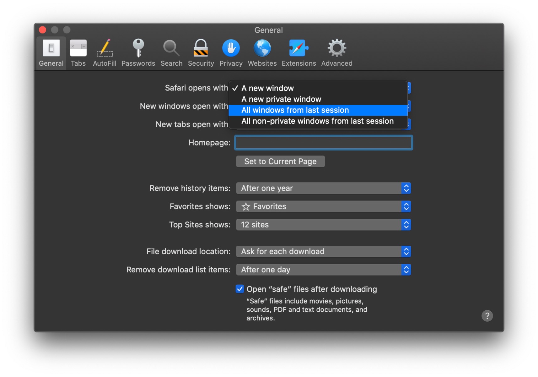 - V rozbalovacej ponuke Safari po otvorení zobrazí vyberte možnosť Všetky okná z poslednej relácie.