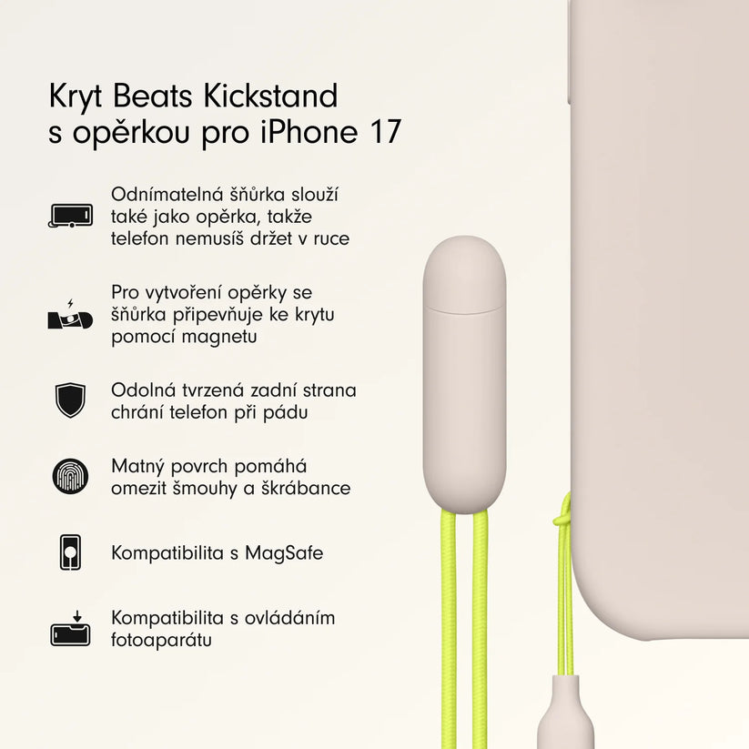 Kryt Beats Kickstand je navrhnutý pre maximálnu ochranu iPhone pred pádmi a poškriabaním. Súčasťou je praktická odnímateľná šnúrka, ktorá zároveň slúži ako opierka na pohodlné sledovanie obsahu v režime na šírku. Stačí adaptér na konci šnúrky vysunúť a pripevniť k magnetickému bodu na strane krytu.